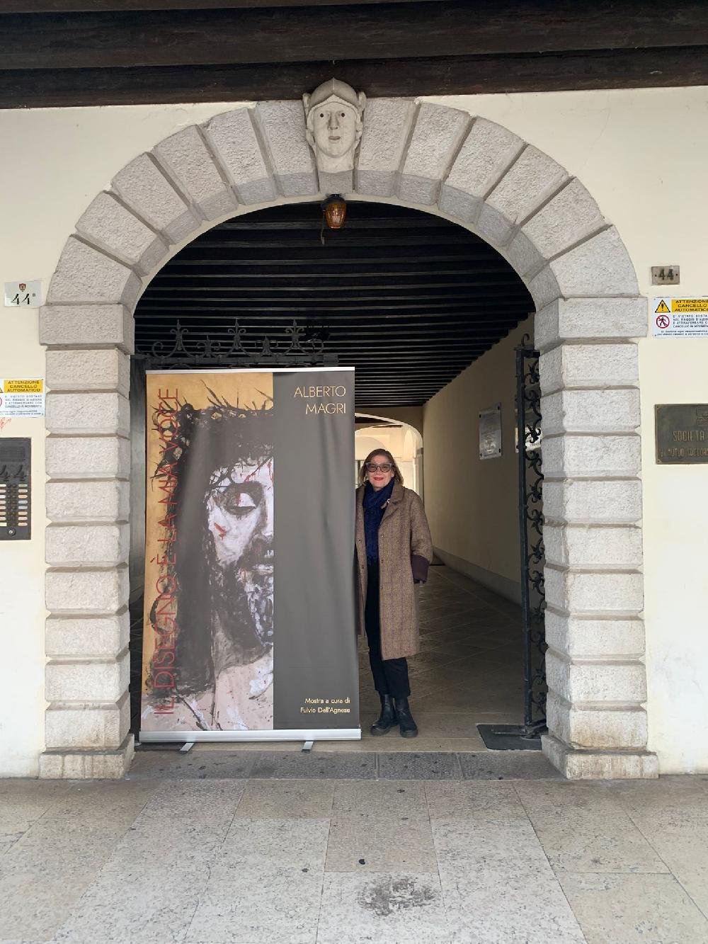 Sulle nere pagine, accostate alle pareti, si succedono così le figure a suo tempo confluite dei diversi volumi realizzati da Alberto, come Menocchio (2016), Quella giungla del mio giardino (2018), La casa del Pordenone (2019), Tethyshadros (2021). Sono disegni compiuti, ma anche studi, appunti e abbozzi, che restituiscono la dimensione di un lavoro in cui l’immagine si assesta per gradi, trovando nella pur contenuta durata della riflessione grafica la propria stabilità. Lo stesso vale, a maggior ragione, per le opere pittoriche di Alberto Magri che completano l’esposizione, nelle quali l’orizzonte dell’artista si apre alla dimensione sacra e alle problematiche sociali.»