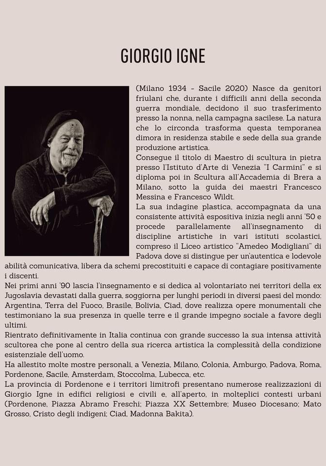 A poche settimane dalla morte di Giorgio Igne, la mostra diventa un omaggio ad un uomo di grande sensibilità che ha posto al centro della sua ricerca artistica la donna come madre, la donna come figura che accoglie, soccorre, custodisce la vita.