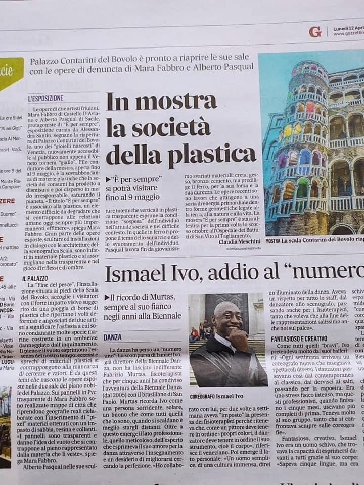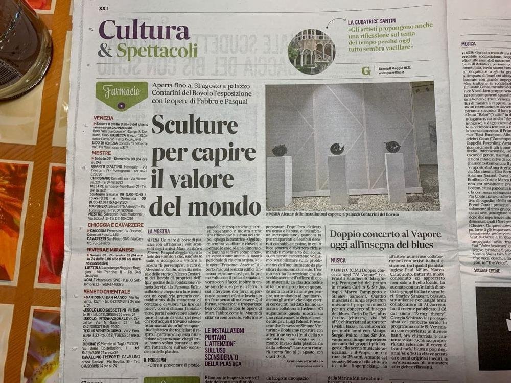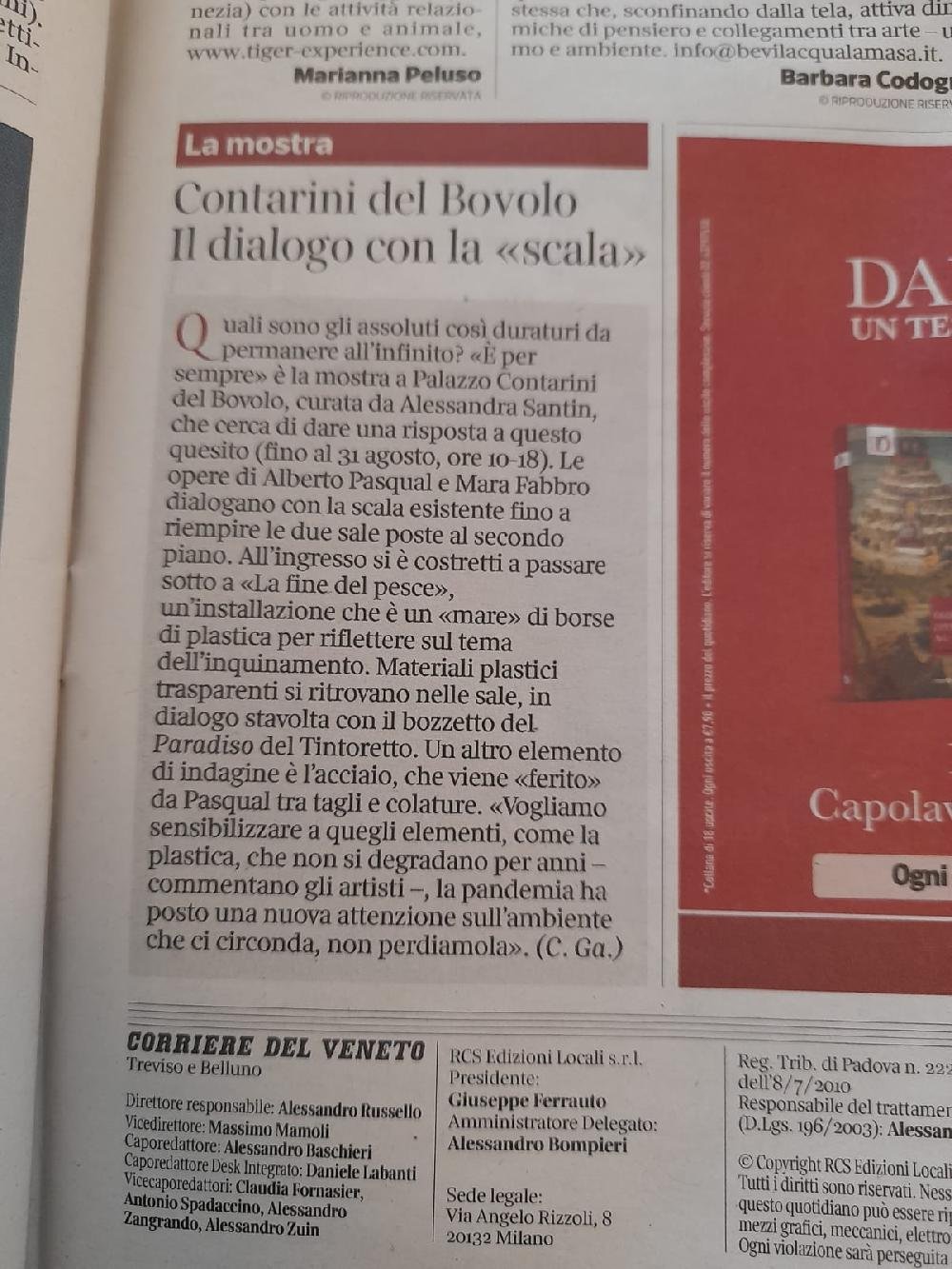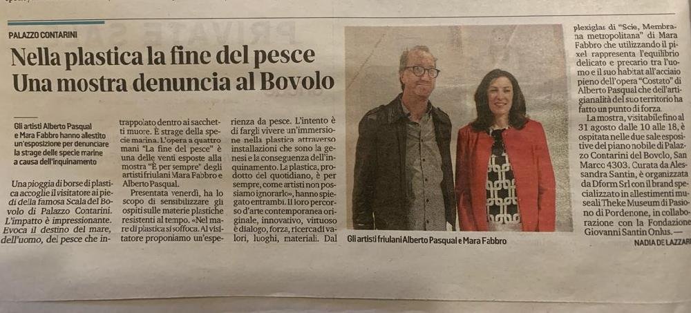 Individui, palazzi, spazi vuoti accostati a volumi pieni: sono le mappe urbane che disegnano i nostri giorni svuotati durante la chiusura forzata, ricolmi di eccessi e di sprechi, di cui la plastica è la metafora primaria. È da questi temi che nasce il progetto curato dagli artisti friulani Mara Fabbro e Alberto Pasqual, una ricerca che approderà in due mostre, la prima in programma in ottobre a San Vito al Tagliamento, la seconda a maggio a Pordenone. Le due esposizioni nascono come momenti e installazioni distinte pur parte di un itinerario artistico che Fabbro e Pasqual portano avanti da due anni. È la materia, la plastica, a diventare non solo linguaggio condiviso, ma anche il tema centrale della prima mostra, dal titolo “È per sempre”, che inaugurerà sabato 3 ottobre nell’antico ospedale dei Battuti di San Vito al Tagliamento, e che gode del patrocinio del Comune di San Vito, realizzata con il supporto degli sponsor Raiffeisen, Credem, Assilab, visitabile nei quattro fine-settimana fino al 25 ottobre (sabati e domeniche dalle 10.30 alle 12.30 e dalle 15.30 alle 19). Il percorso espositivo si sviluppa su tre livelli: ad accogliere il visitatore al piano terra sarà una imponente installazione, “La fine del pesce”, un labirinto (a misura di sicurezza antiCovid per evitare la contaminazione) ricavato tra un mare di borse di plastica. Lo spettatore viene coinvolto in una traversata immersiva che rimanda alla percezione di soffocamento e di boccheggiamento, fino a condure a una seconda installazione “Trasparenze”, progetto che accosta le “Membrane”, mappe metropolitane, di Mara Fabbro alle strutture verticali totemiche “Presenze/assenze” di Alberto Pasqual. «Desideriamo testimoniare che siamo ancora lontani da una reale consapevolezza degli effetti nocivi delle materie plastiche abbandonate nell’ambiente dall’uomo. Intendiamo sensibilizzare il visitatore sulle problematiche dello smaltimento di questo prodotto e sull’inquinamento dei mari con materiali plastici, facendogli fare un’esperienza da pesce» spiegano i due artisti. La mostra si sviluppa al primo e al secondo piano con altre due esposizioni, le personali dei due artisti. Salendo ci si imbatte nella personale di Mara Fabbro, artista che lavora con tasselli da lei stessa creati, minuscoli parallelepipedi materici di base quadrata, “pixel” che accostati all’altro riproducono mappe che raffigurano geografie reali. Se per Fabbro è l’acqua il discrimine per la sua ricerca, nelle opere di Alberto Pasqual è il fuoco l’elemento che plasma la materia, artista di cui si svolge la mostra personale al secondo piano. Si tratta di una ventina di opere, per lo più inedite, che ripropongono il tema dello squarcio, e dello svuotamento dell’individuo. A questa prima mostra fa da contrappunto “È… vuoto”, opera collettiva che vede al lavoro i due artisti con il contributo di una comunità ampia, progetto nato durante il lockdown, che si terrà a maggio nell’ex Tipografia Savio di via Torricella a Pordenone. Completa le due mostre il catalogo con testi e saggi critici di Alessandra Santin, Giada Centazzo, Lorenza Gava, Mariateresa Setaro Chaniac.