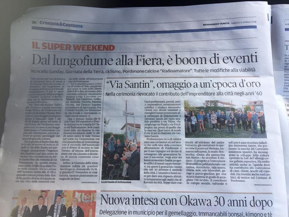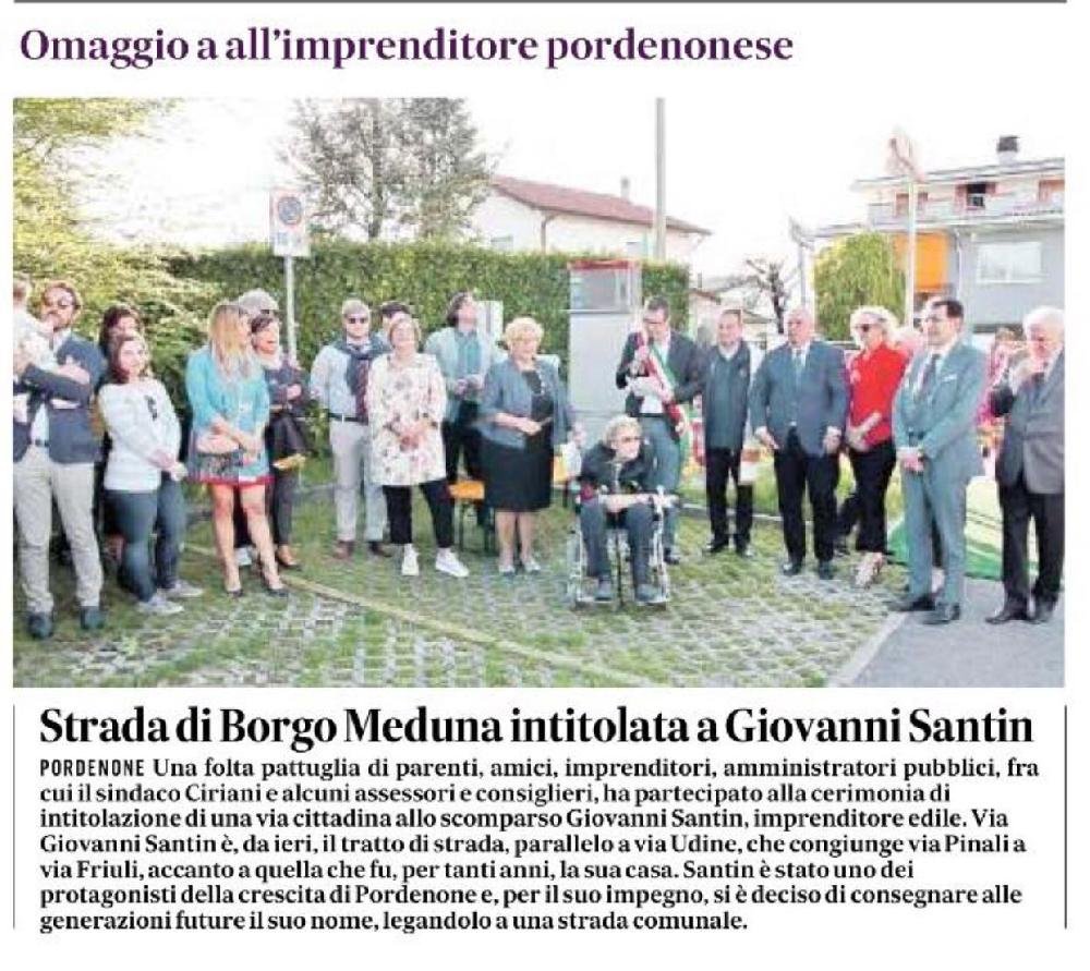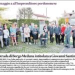 PORDENONE – Tantissima gente e numerose autorità ieri, 19 aprile, in occasione dell’intitolazione di una strada (nei pressi di via Pinali, a Borgomeduna) dedicata a Giovanni Santin, grande imprenditore di Pordenone.