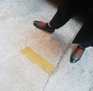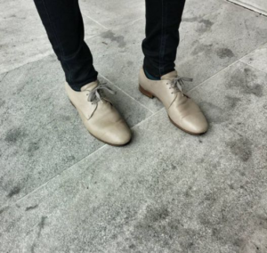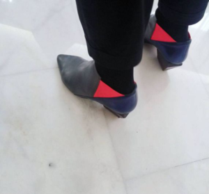 Sono tre i colori a caratterizzare questa scarpina che la proprietaria abbina ad un pantalone nero. In questo modello dall’ampia calzata, sono le impunture a definire i colori dei pellami: il blu scuro, il verde e la tonalità cuoio. Chissà se questa signora è una di quelle a cui sono riuscita a “far portare i moustaches”: magari ero così concentrata nei moustaches che non ho prestato attenzione a ciò che indossava ai piedi. Che disdetta!