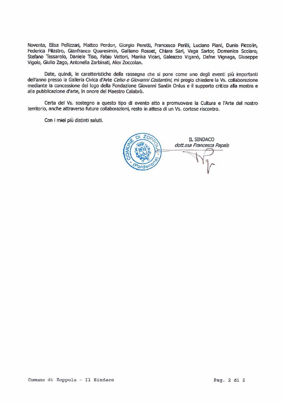 L’Associazione Amici della galleria del Cardinale Costantini e l’Assessorato alla Cultura del Comune di Zoppola, insieme a tutti gli artisti presenti con le loro opere (inserire elenco) vanno ringraziati per l’apporto dato al progetto e alla sua esecuzione, testimonianza di quanto sia importante la collaborazione nel presente contemporaneo,  sempre più rivolto verso un percorso luminoso di cambiamento, che avviene attraverso ogni gesto, ogni scelta, ogni momento vissuto con l’arte.